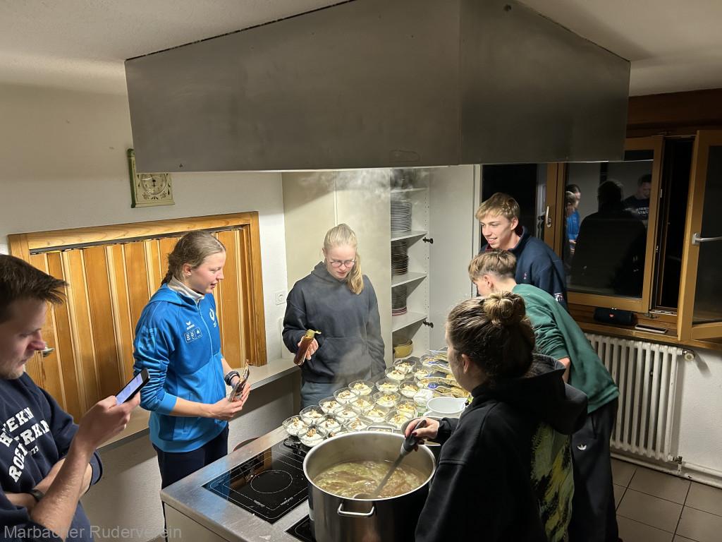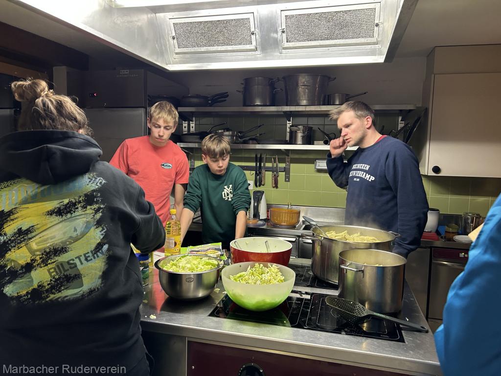 Ein weiterer Schlüssel zum Erfolg war die ausgezeichnete Organisation im Selbstversorgerhaus. Unter der Leitung von Küchenchefin Isa und wechselnden Helferinnen und Helfern wurde preisgünstig und abwechslungsreich gekocht. Das Abendprogramm mit Filmvorführung („The Boys in the Boat“), Quiz- und Spielabenden sowie einem Yoga-Angebot von Ruderin und Yogalehrerin Sabine rundete das Trainingslager ab.